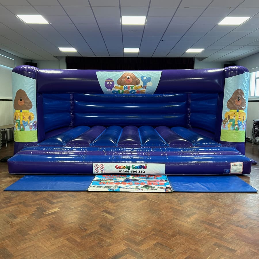 Glossy Blue and Purple Hey Duggee Bouncy Castle is available to hire across Essex, including Benfleet, Basildon & Southend, as well as all areas of our county.