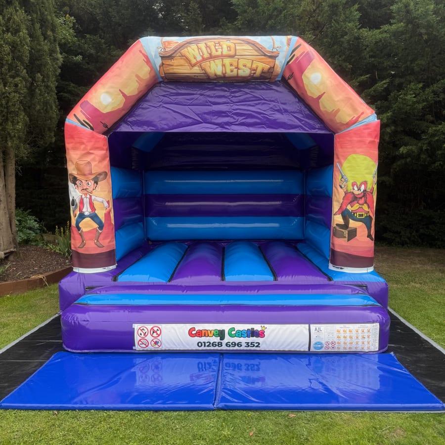 Whether you're hosting a birthday party, school fair, family BBQ, or community event, the canvey castles 12ft x 12ft Light Blue and Purple Country and Western Bouncy Castle in Essex guarantees laughter and excitement. Its unique theme inspires imaginative play, while the spacious jumping area keeps kids entertained for hours.