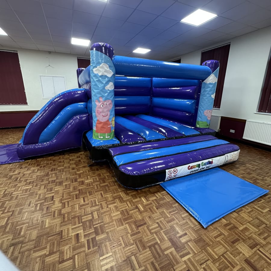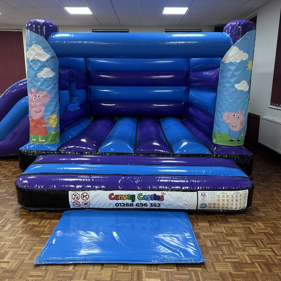 Brighten your next event with the canvey castles 16ft x 17ft Blue and Purple Peppa Pig Design 2 Low Height Slide Combo Bouncy Castle in essex. This eye-catching blue and purple inflatable blends a roomy bounce area with a gentle slide. It’s perfect for toddlers and young children. Designed for safe, active play. Built for easy setup and reliable performance.