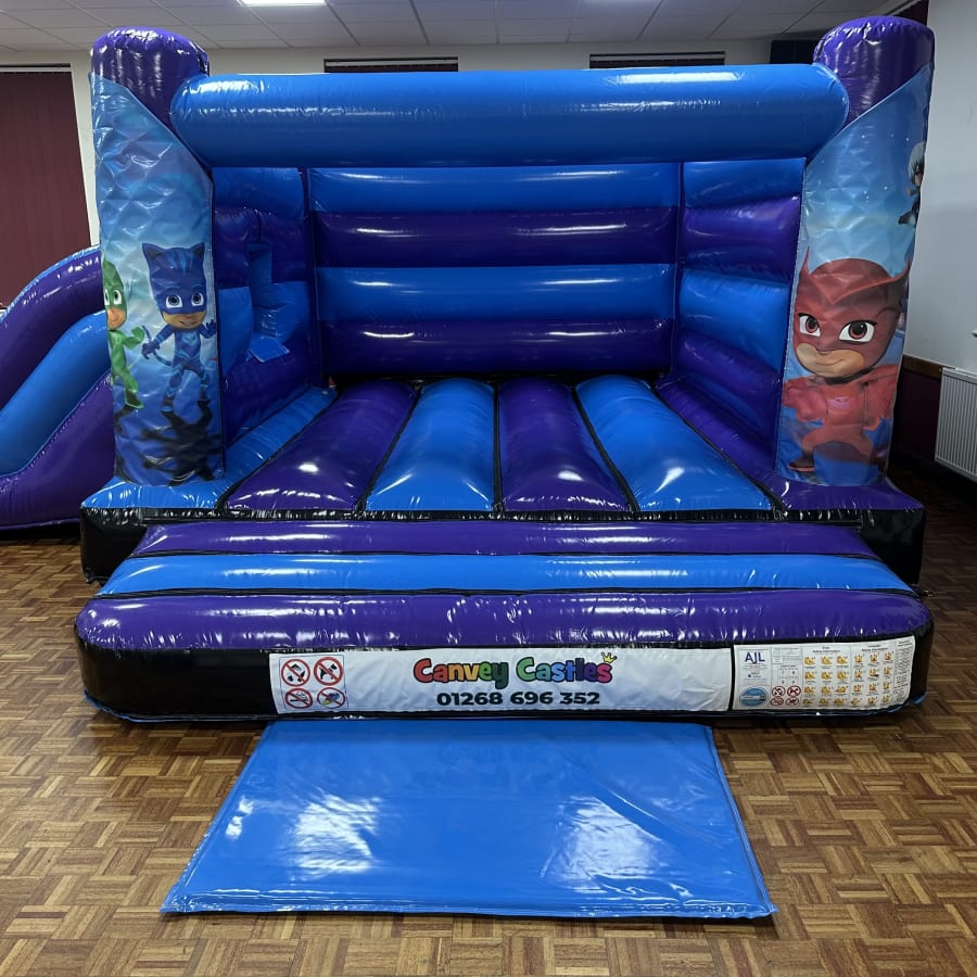 canvey castles 16ft x 17ft Blue and Purple PJ Masks Low Height Slide Combo Bouncy Castle in essex is a vibrant, family-friendly inflatable designed for younger kids. Bright PJ Masks graphics, a low-height slide and a roomy play area make this combo perfect for birthday parties, school events and community fairs across Essex.