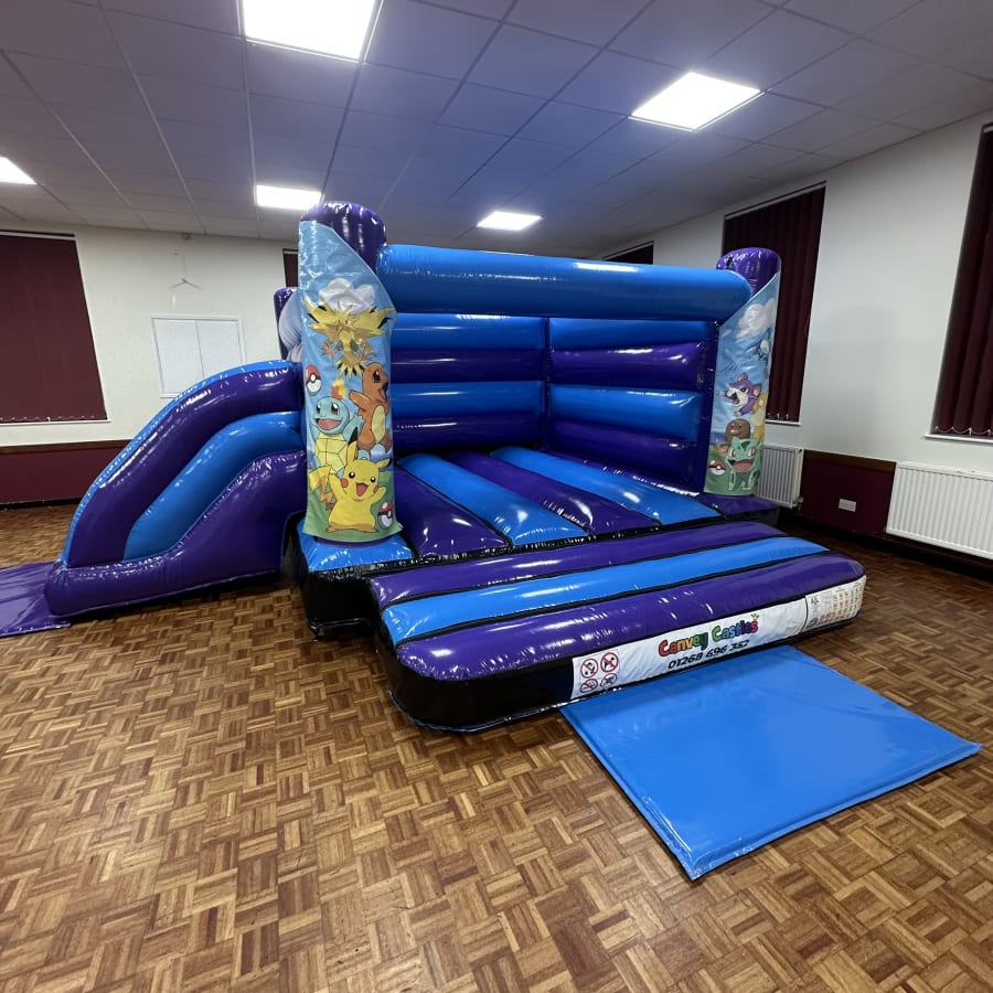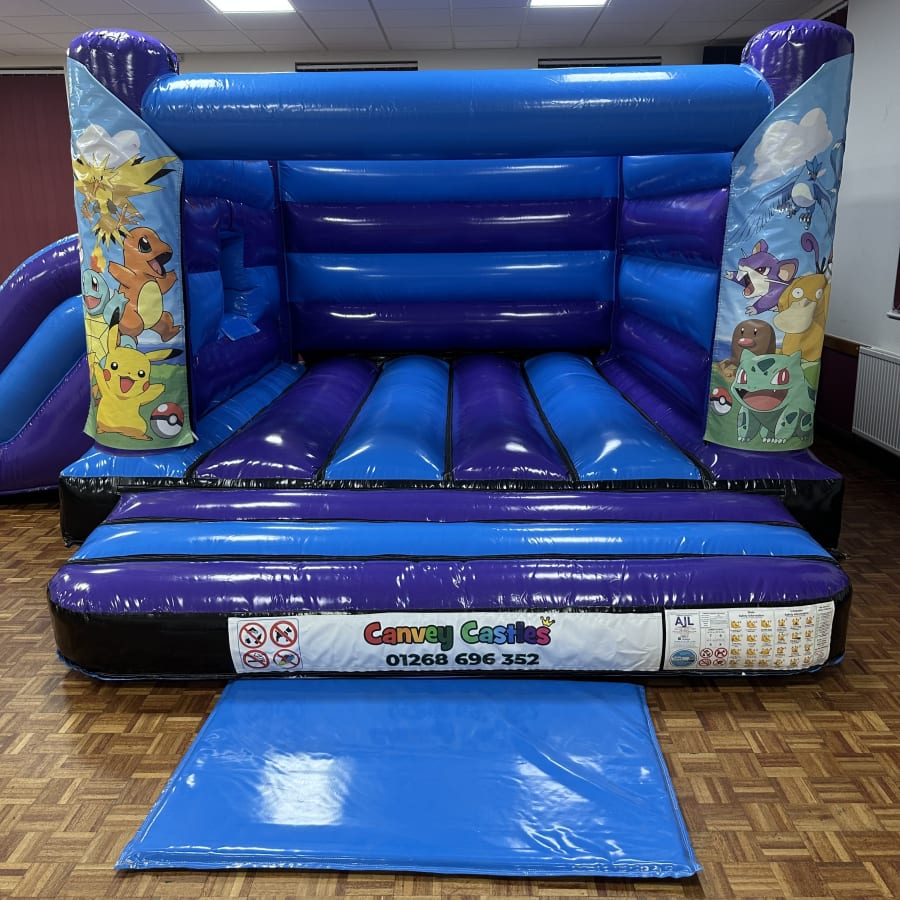 Secure your date today. Contact Canvey Castles to reserve the 16ft x 17ft Blue and Purple Pokemon Low Height Slide Combo Bouncy Castle and make your Essex event unforgettable.