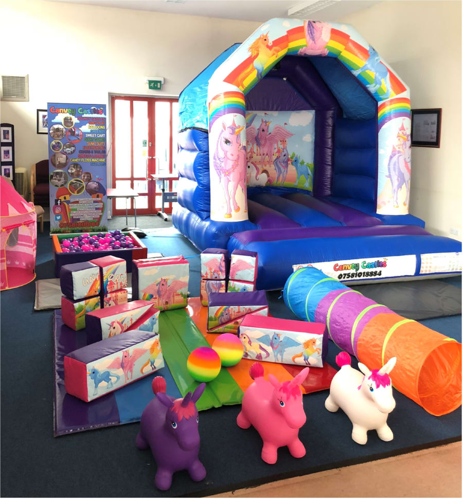 Package five is our unicorn themed soft play package with any of Unicorn extra small, small or medium bouncy Castle. Upgrade to our Unicorn slide combo inflatable for just £20. This Package includes the following items: 3 unicorn hoppers, 2 rainbow mats, play tunnel, pop up tent, ball pit, 15 piece shape set.