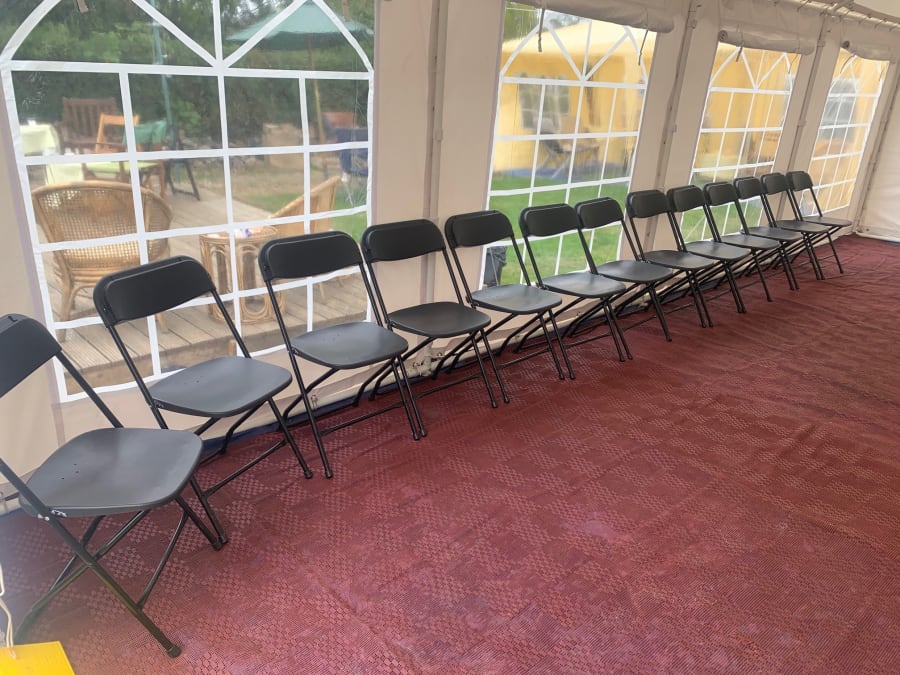 Black folding samsonite chair, suitable for indoor use or outdoor on hard standing surface.