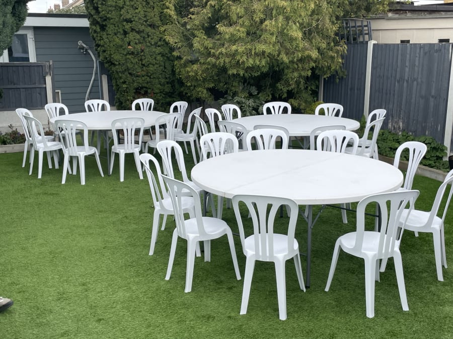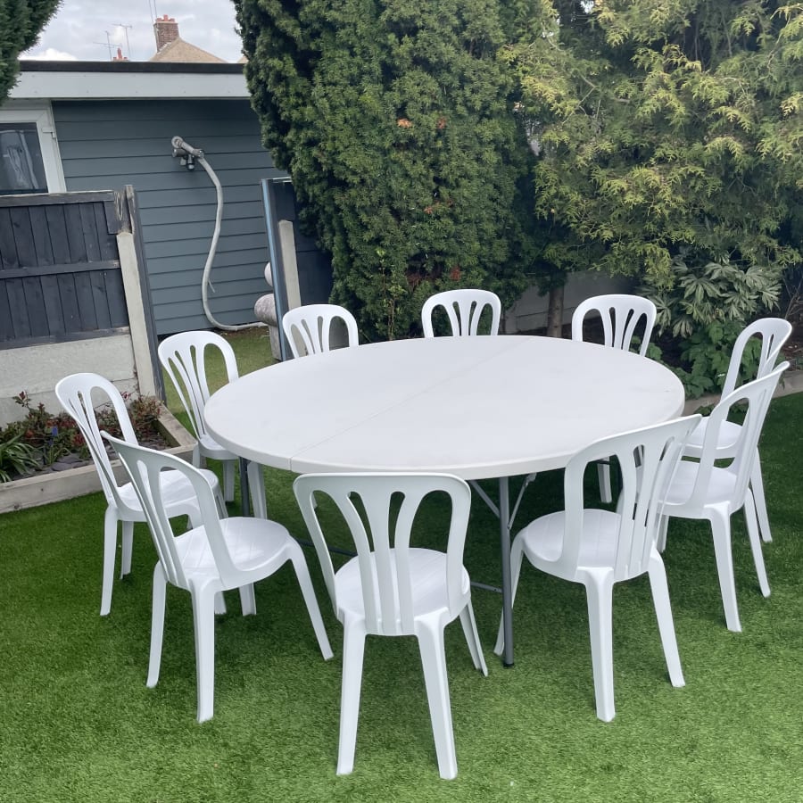 6ft white round table suitable for indoor use or outdoor on hard standing surface.
