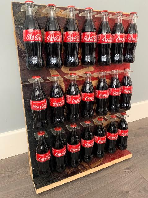 OUR PRINTED COCA COLA ARTWORK PALLET DESIGN GLASS BOTTLE HOLDER WALL. THIS IS A RARE AND EXCITING WAY TO DISPLAY YOUR RETRO COKE BOTTLES ON OUR WALL, OUR COCA COLA WALL HOLDS 21 RETRO GLASS 33CL (330ML) BOTTLES. THIS WALL IS FREE STANDING AND CAN BE PLACED ON ANY TABLE TOP. (WE CAN ALSO SUPPLY THE COCA COLA BOTTLES DIET OR NORMAL AT EXTRA COST PLEASE ENQUIRE).