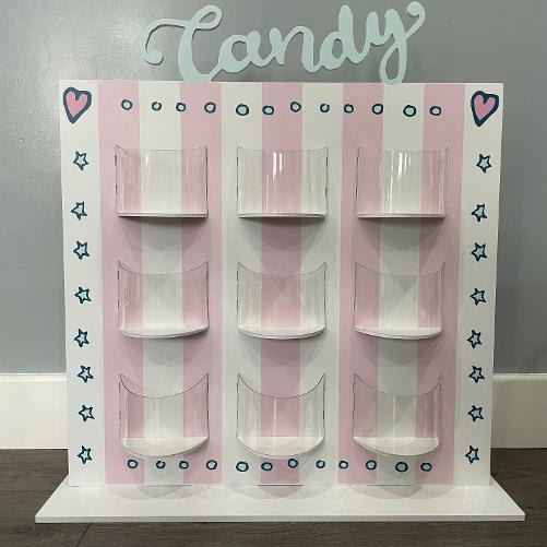 OUR FANTASTIC WHITE SWEET PIC 'N' MIX WALL WITH CLEAR ACRYLIC POCKETS. THIS IS A EYE CATCHING ADD ON TO ENHANCE YOUR PARTY. THE WALL HOLDS UP TO 5KG (4 CATERING TUBS OF SWEETS) THIS WALL IS FREE STANDING AND CAN BE PLACED ON ANY TABLE TOP. WE ALSO CAN SUPPLY THE SWEETS AND BAGS AT AN ADDITIONAL CHARGE.