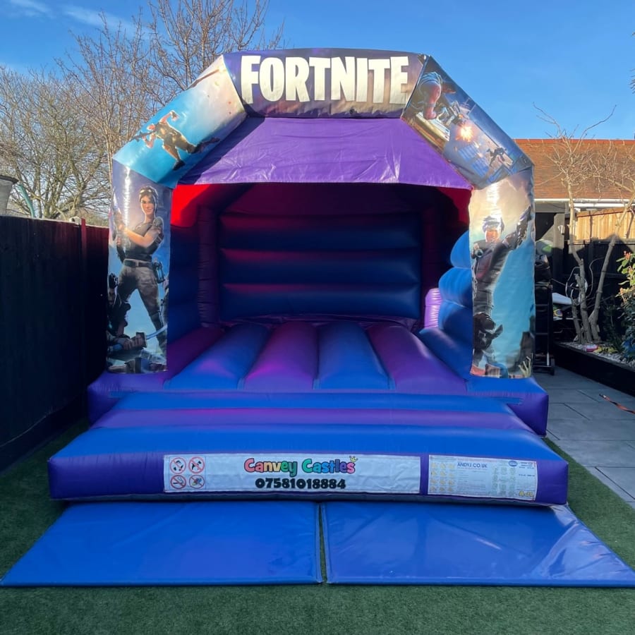 Booking the 12ft x 15ft Blue and Purple Fortnite 1 Bouncy Castle in Essex has never been easier. Our user-friendly online booking system allows you to secure your bouncy castle in just a few clicks. Once booked, our dedicated team will handle the delivery and setup, ensuring everything is in place for your event. With Canvey Castles, you can expect punctual service and hassle-free arrangements, letting you focus on enjoying the day with your guests.