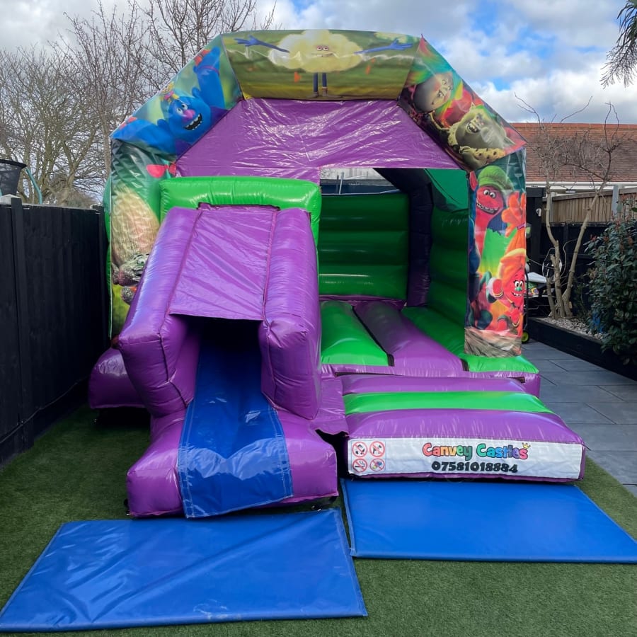 Unleash the Fun with Our 12ft x 17ft Green and Purple Trolls Slide Combo Bouncy Castle