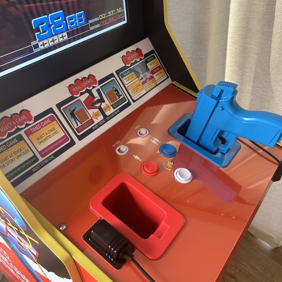 Engage in a thrilling showdown against Wild Dog and other fierce boss characters in the timeless arcade shooting game equipped with WiFi-connected leaderboards... no need for a subscription! But wait, there's more! This 4-in-1 machine also offers beloved arcade favorites including Point Blank, Steel Gunner, and Steel Gunner 2. No need to keep feeding quarters either!