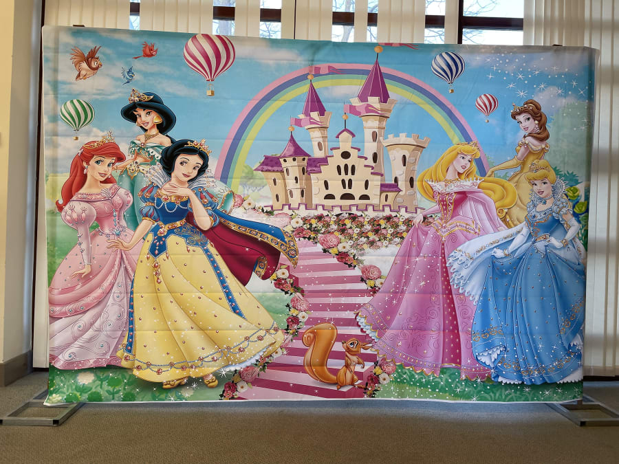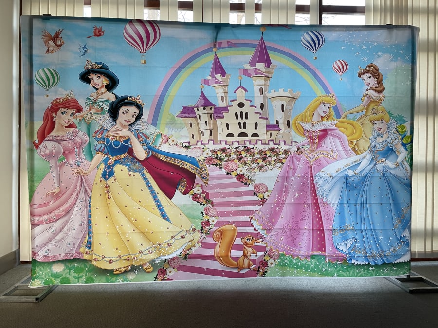 Disney Princess themed backdrop wall, a wonderfull way to have your picture taken with your friends and family. This birthday backdrop wall hire service will add the golden touch to your images for you to glance back on time and time again. Creating loving memories of the best times you had on your special day.