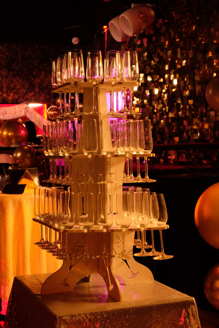 OUR LARGE TABLE TOP CHAMPAGNE TOWER AVAILABLE TO HIRE IN ESSEX IS A FANTASTIC WAY TO TOAST YOUR GUESTS, WE PROVIDE ALL FLUTES, THE CLEAR GLASSES SPARKLE IN THE LIGHT. THIS TOWER HOLDS 48 GLASSES.