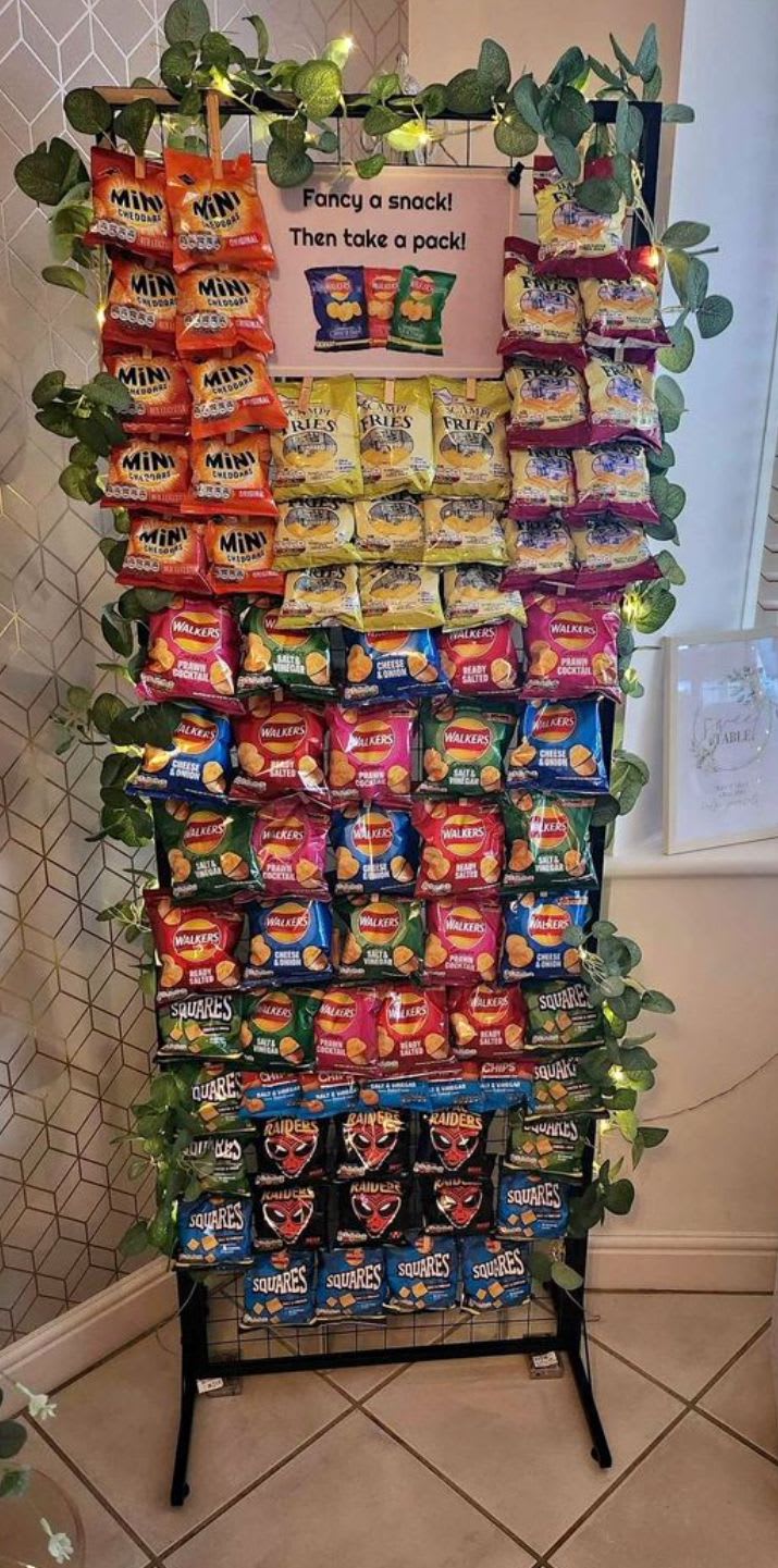 The Crisp Wall is not just your average snack station. It's a visually appealing display that is sure to catch the eye of your guests. Picture a colorful array of everyone's favorite crisps beautifully presented on a sleek and stylish backdrop. Whether you're a crisp aficionado or simply looking to add a fun element to your event, the Crisp Wall is the perfect choice.