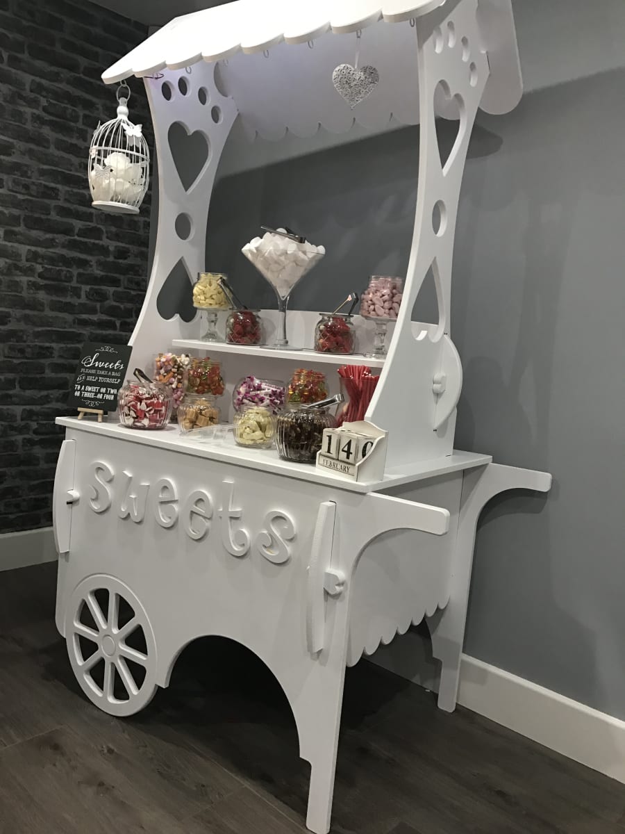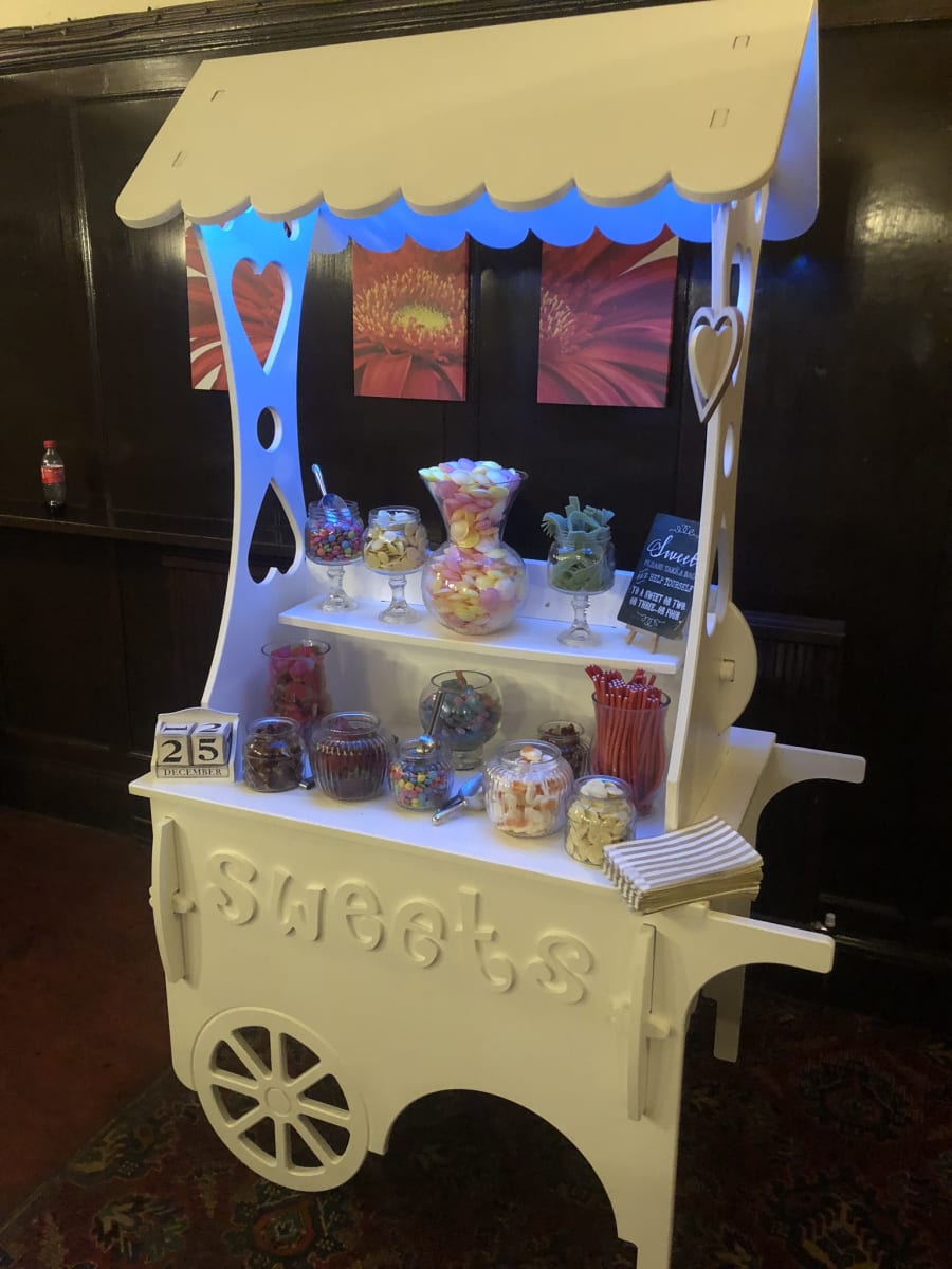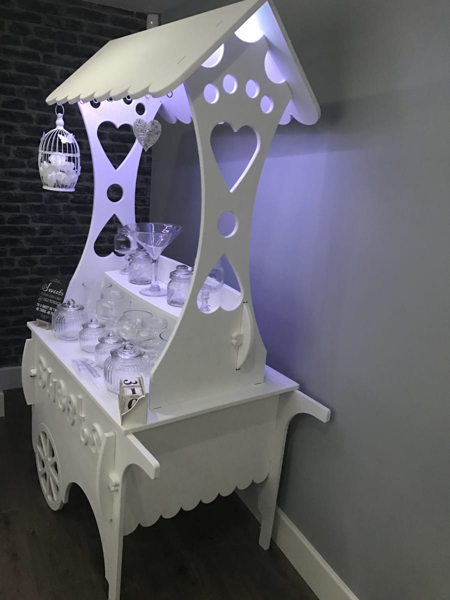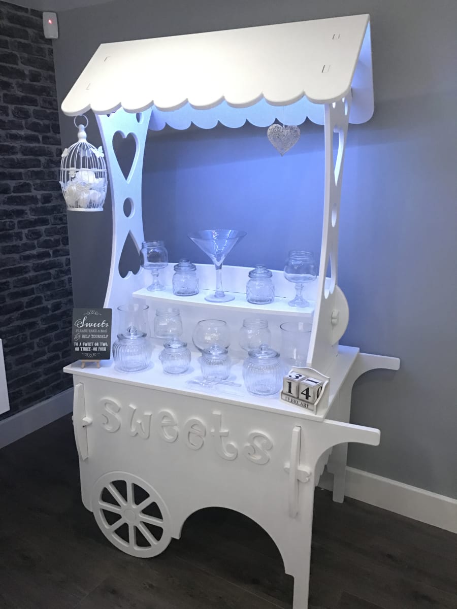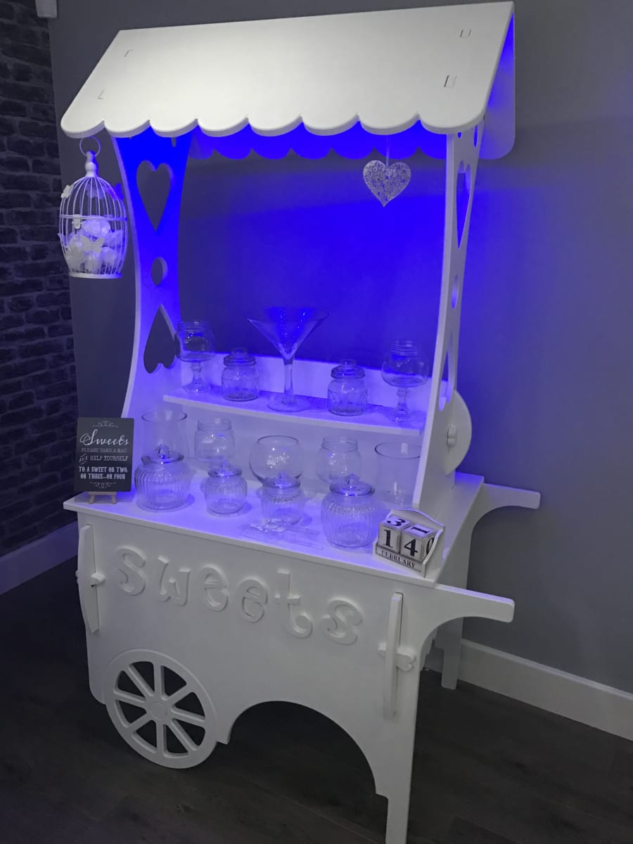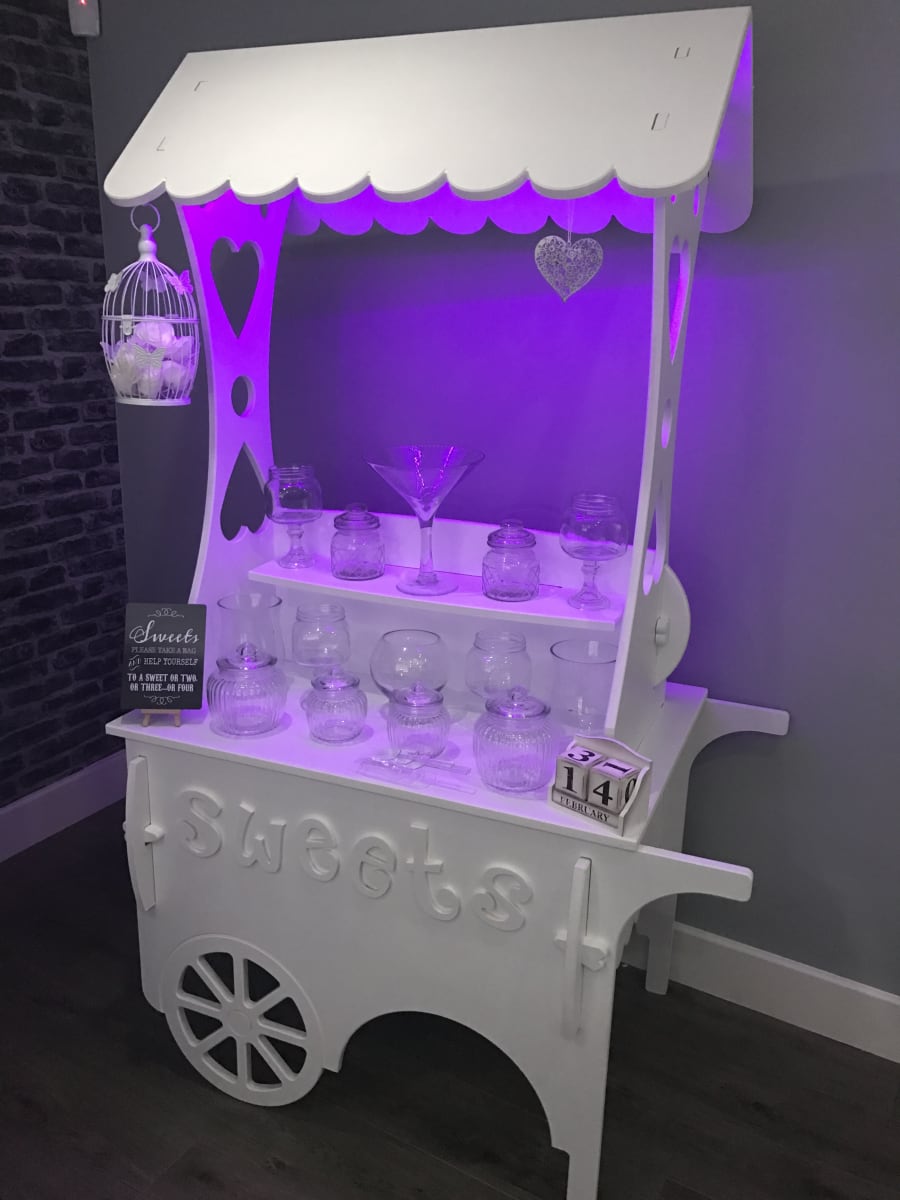 This exciting sweet cart will give your event the hidden sparkle it needs, featuring built in mood lights where you can choose from a range of colours to enable the cart to glow. This package includes 12 mixed sized glass jars, prongs, scoops and decorations. This sweet cart is great for all occasions birthdays, weddings and christenings. Stocking a huge range of sweets for you to choose SWEETS and coloured BAGS At an additional charge.