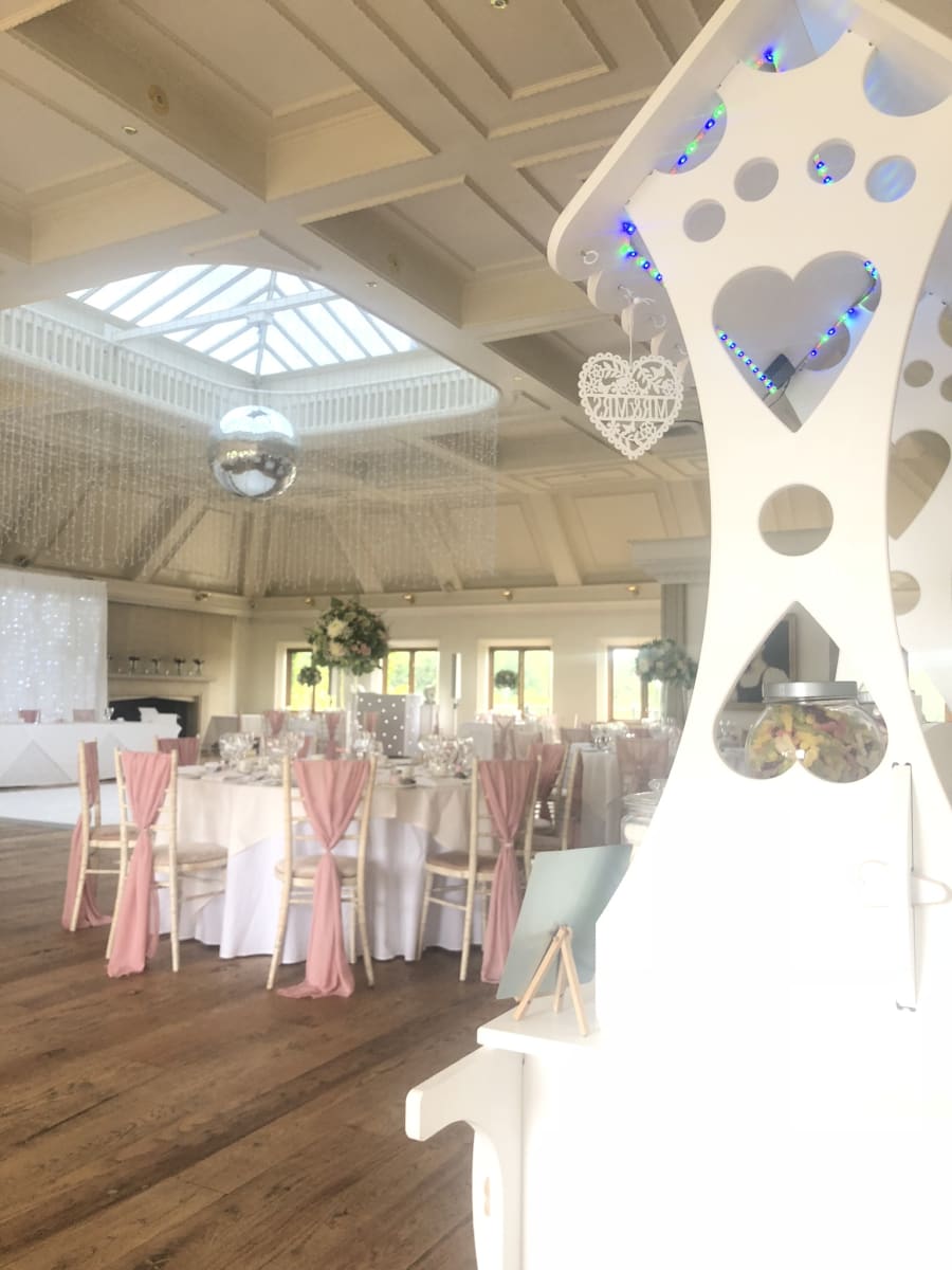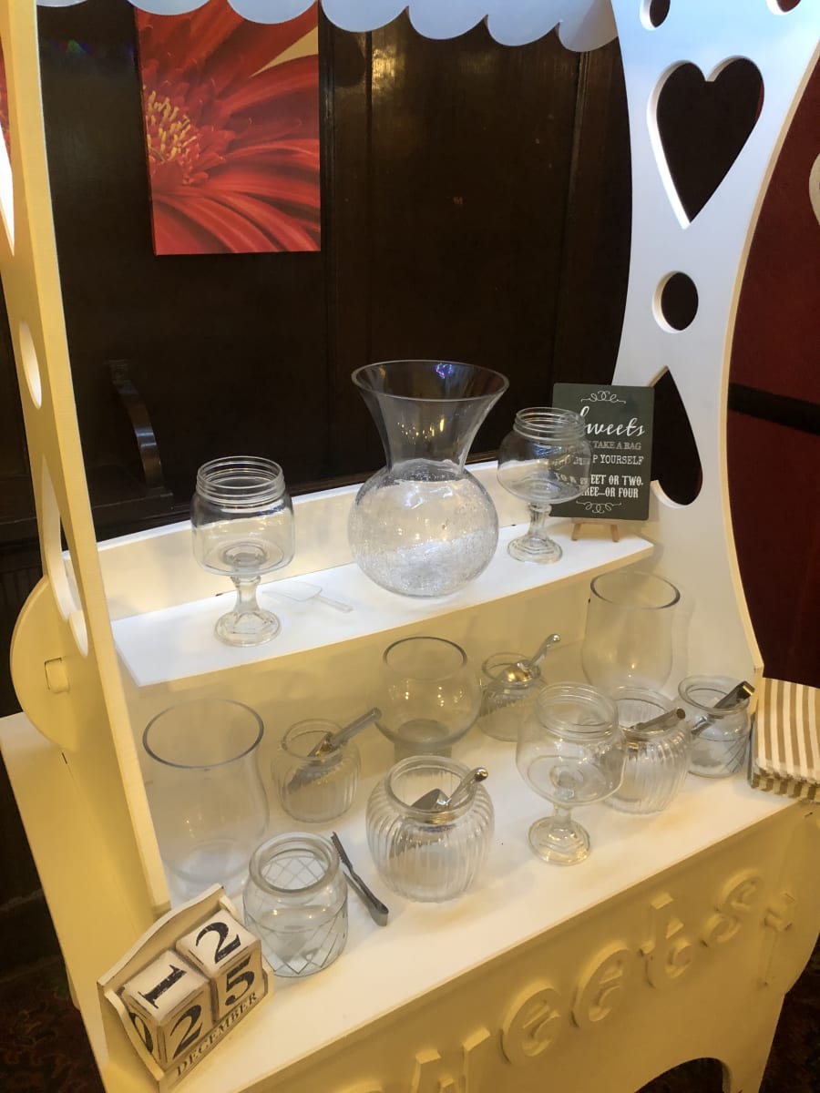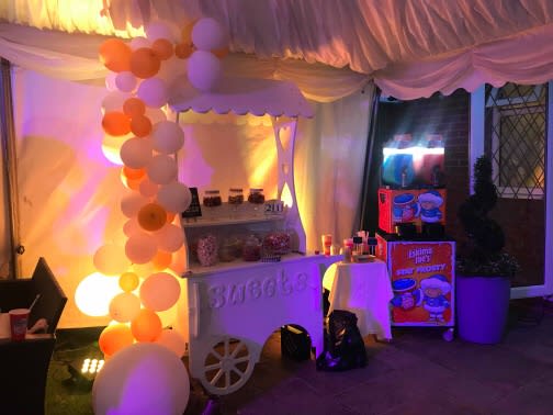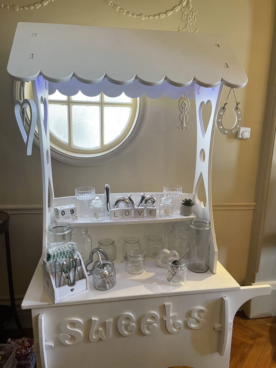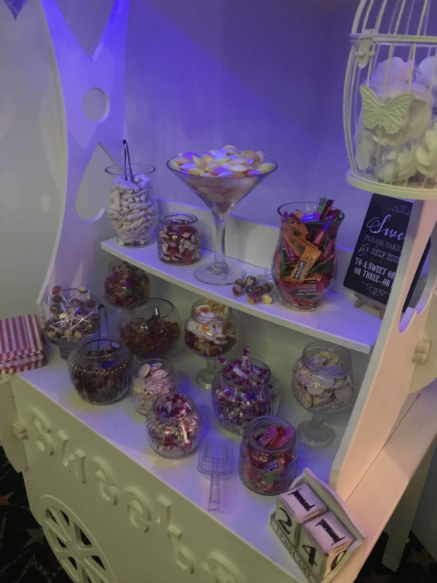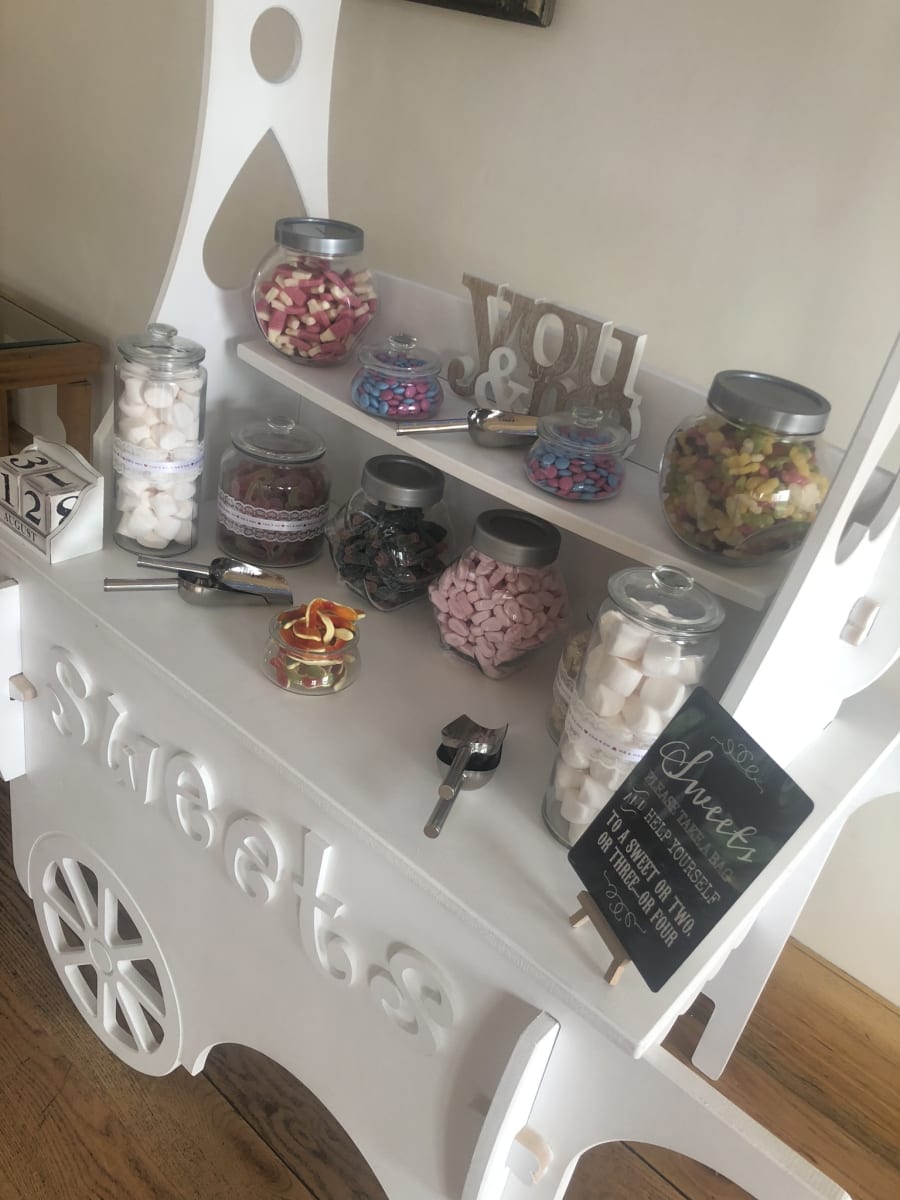 This exciting sweet cart will give your event the hidden sparkle it needs, featuring built in mood lights where you can choose from a range of colours to enable the cart to glow. This package includes 12 mixed sized glass jars, prongs, scoops and decorations. This sweet cart is great for all occasions birthdays, weddings and christenings. Stocking a huge range of sweets for you to choose SWEETS and coloured BAGS At an additional charge.