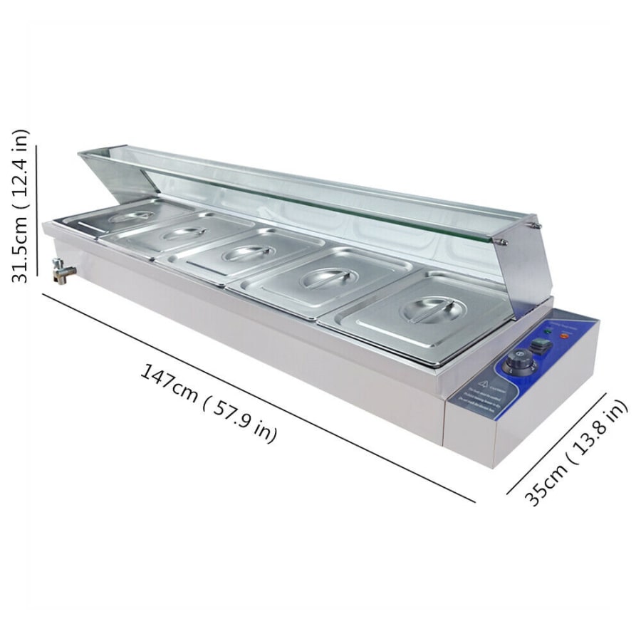 Our 5-pan food warmer bain-marie is a piece of kitchen equipment used to keep food warm and ready for service. It typically consists of a stainless steel cabinet or base with a heating element and a water bath. The water bath is filled with water and heated, which in turn heats the pans containing the food.