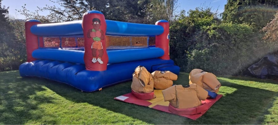 Sumo wrestling mats, neck padding, and head protection are included in our family sumo suit package, which includes two suits for children and two suits for teenagers and adults.