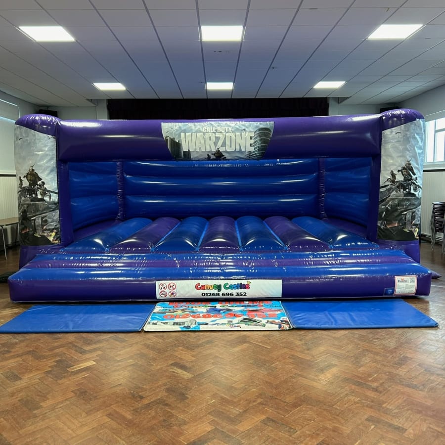 Glossy Blue and Purple Call of Duty Warzone Bouncy Castle is available to hire across Essex, including Benfleet, Basildon & Southend, as well as all areas of our county.
