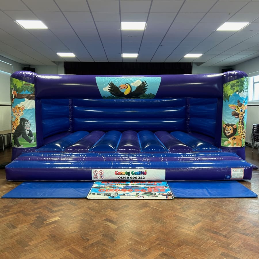 Glossy Blue and Purple Jungle Bouncy Castle is available to hire across Essex, including Benfleet, Basildon & Southend, as well as all areas of our county.