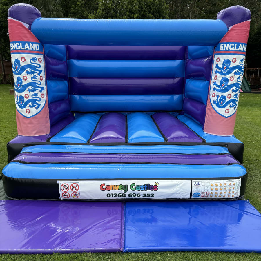 This 12ft x 12ft Blue and Purple England Low Height Bouncy Castle is the perfect addition to any event in Essex. With its vibrant colors and low height design, it is suitable for indoor and outdoor use, making it ideal for children's parties, school events, and family gatherings.