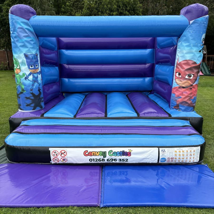 Book our 12ft x 12ft Blue and Purple PJ Masks Low Height Bouncy Castle today and create unforgettable memories for your child's special day!