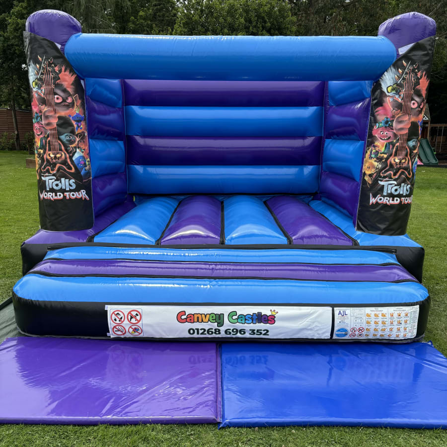 Book the 12ft x 12ft Blue and Purple Trolls World Tour Low Height Bouncy Castle for your next event in Essex and let the good times roll!