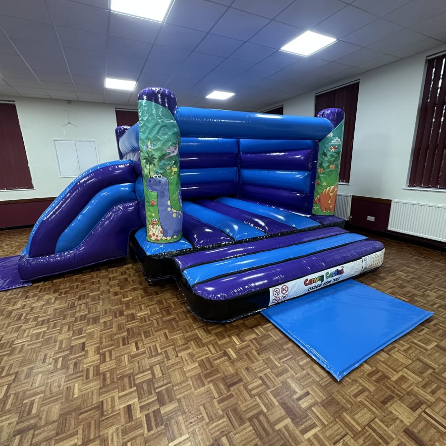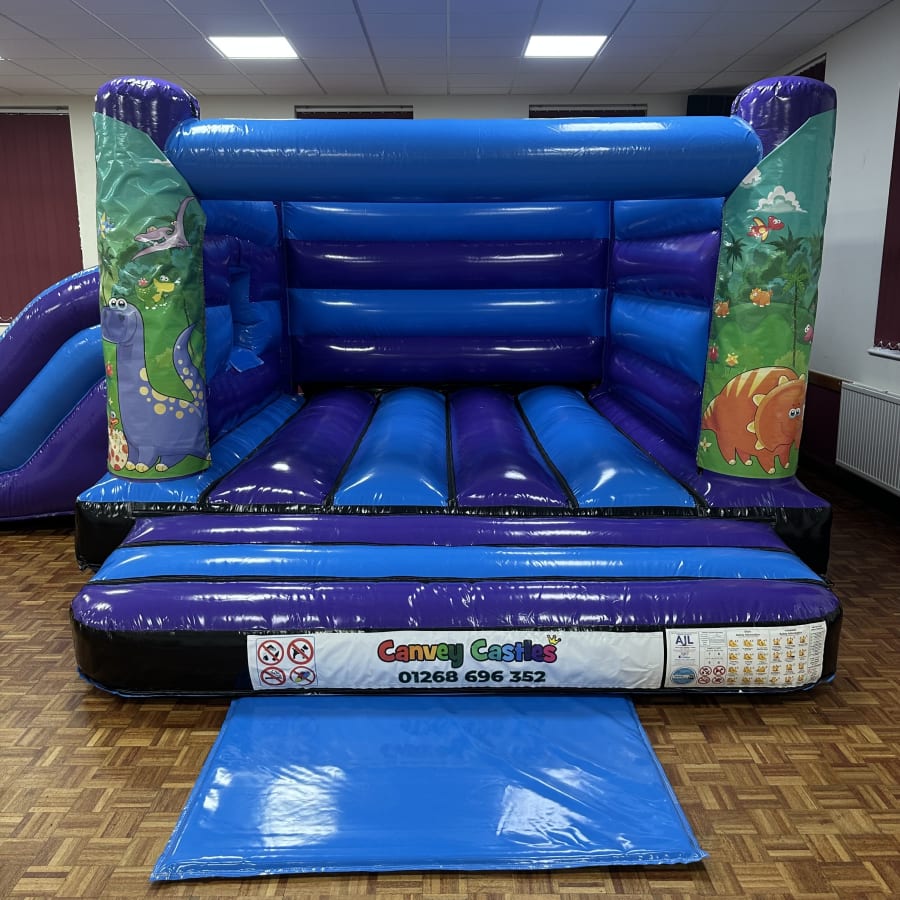 Bright. Safe. Fun. The 16ft x 17ft Blue and Purple Dinosaur Low Height Slide Combo Bouncy Castle delivers big smiles for little adventurers. This compact combo offers a bouncing area and a low, easy slide. It’s ideal for toddlers, nurseries, birthday parties and community events. Book with confidence. canvey castles 16ft x 17ft Blue and Purple Dinosaur Low Height Slide Combo Bouncy Castle in essex.