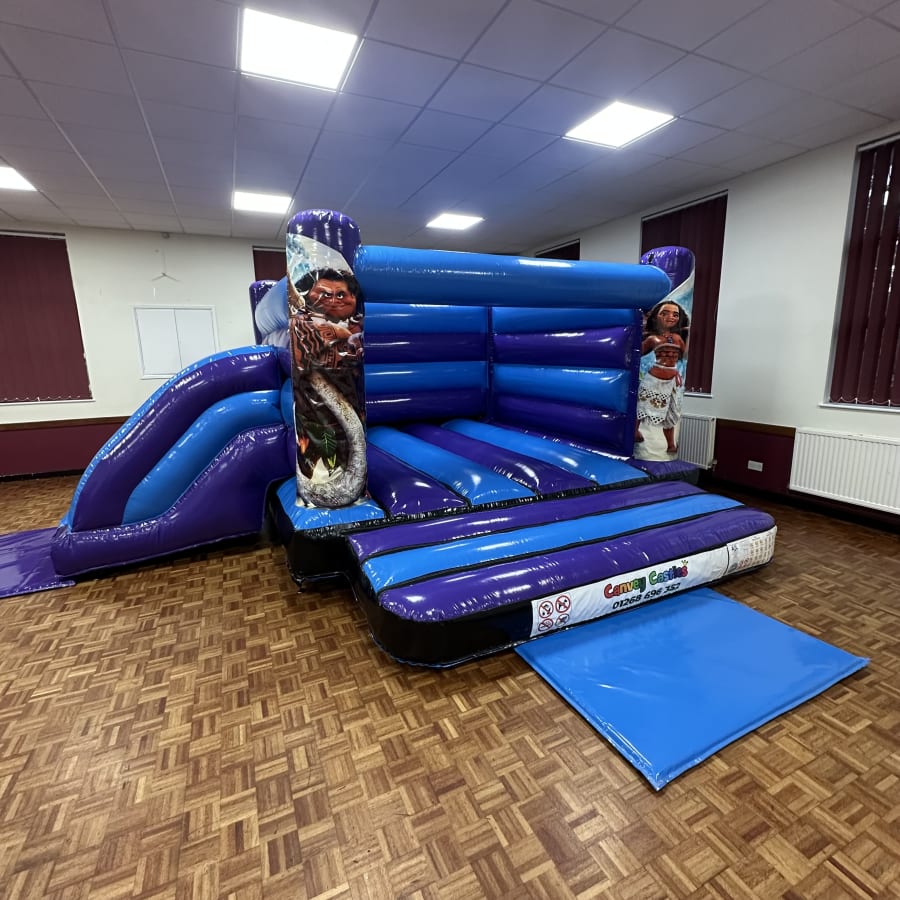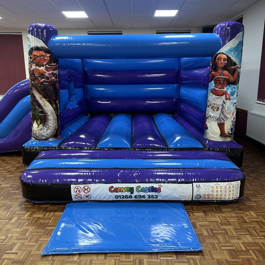 Reserve the 16ft x 17ft Blue and Purple Moana Low Height Slide Combo Bouncy Castle with Canvey Castles today. Contact us to check availability, get a quote, or arrange delivery in Essex. Quick confirmations and flexible hire slots make party planning simple.