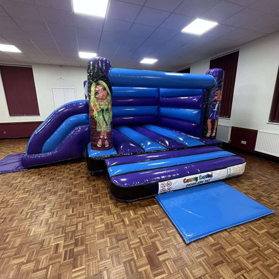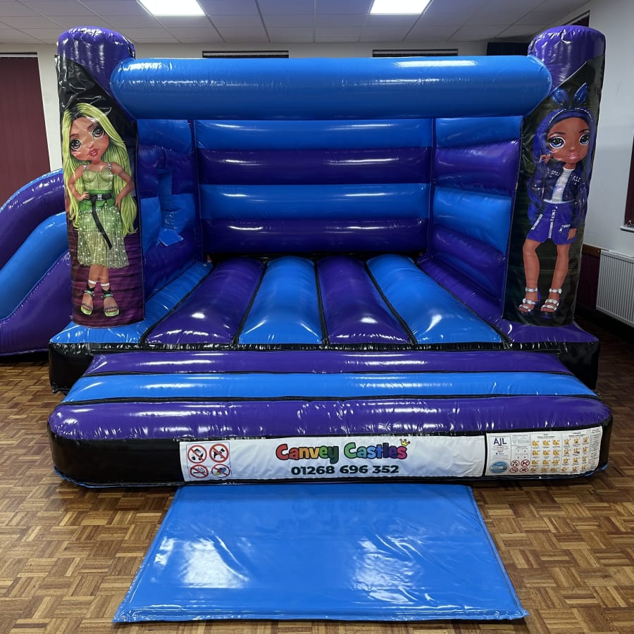 Rent the canvey castles 16ft x 17ft Blue and Purple Rainbow High Low Height Slide Combo Bouncy Castle in essex for vibrant, safe fun at parties and events. This eye-catching combo combines a spacious bounce area, twin-height slide, and rainbow-themed design. It’s ideal for children’s parties, school fetes, and community events across Essex.