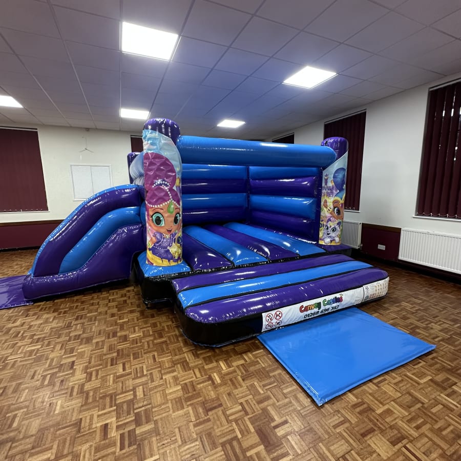 All hires include a safety briefing and full setup. We operate across essex with insured delivery, secure anchor points, and on-site checks. Book early to secure weekend dates. For fast quotes and availability contact our team. Choose canvey castles 16ft x 17ft Blue and Purple Shimmer and Shine Low Height Slide Combo Bouncy Castle in essex and make your event sparkle.