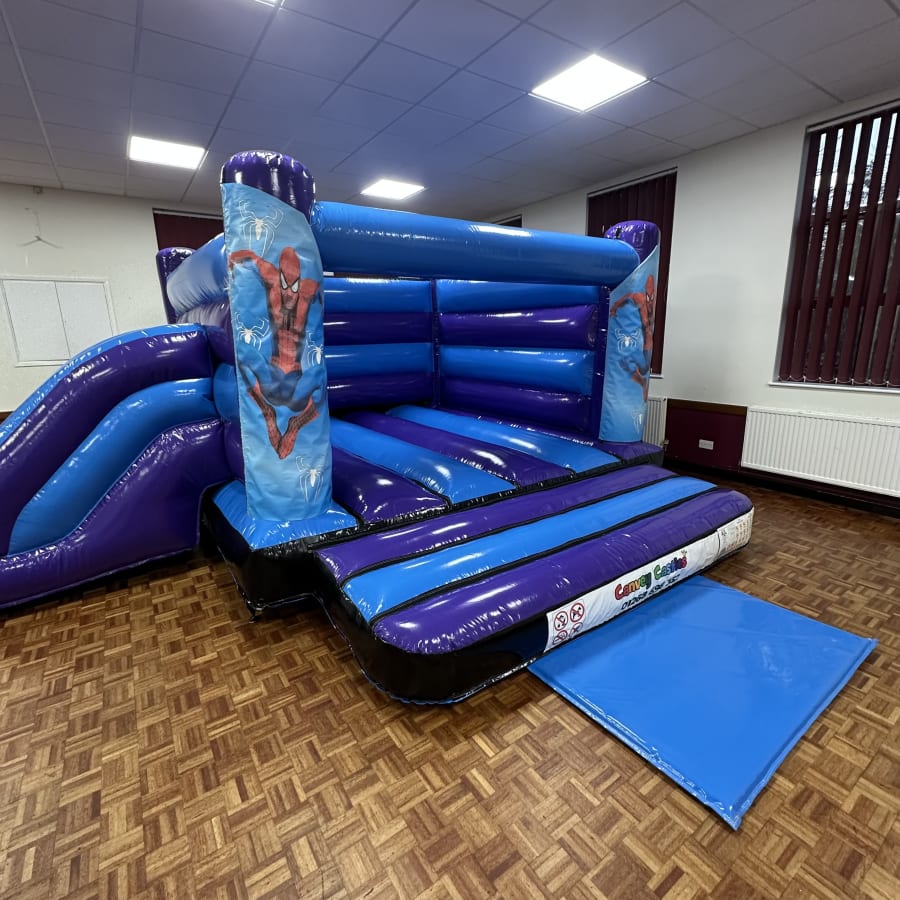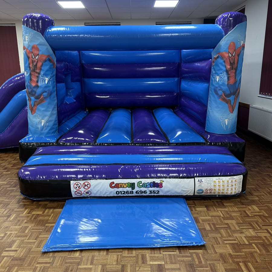 Book the 16ft x 17ft Blue and Purple Spider-man Low Height Slide Combo Bouncy Castle today. Secure your date with Canvey Castles and make your Essex event unforgettable.