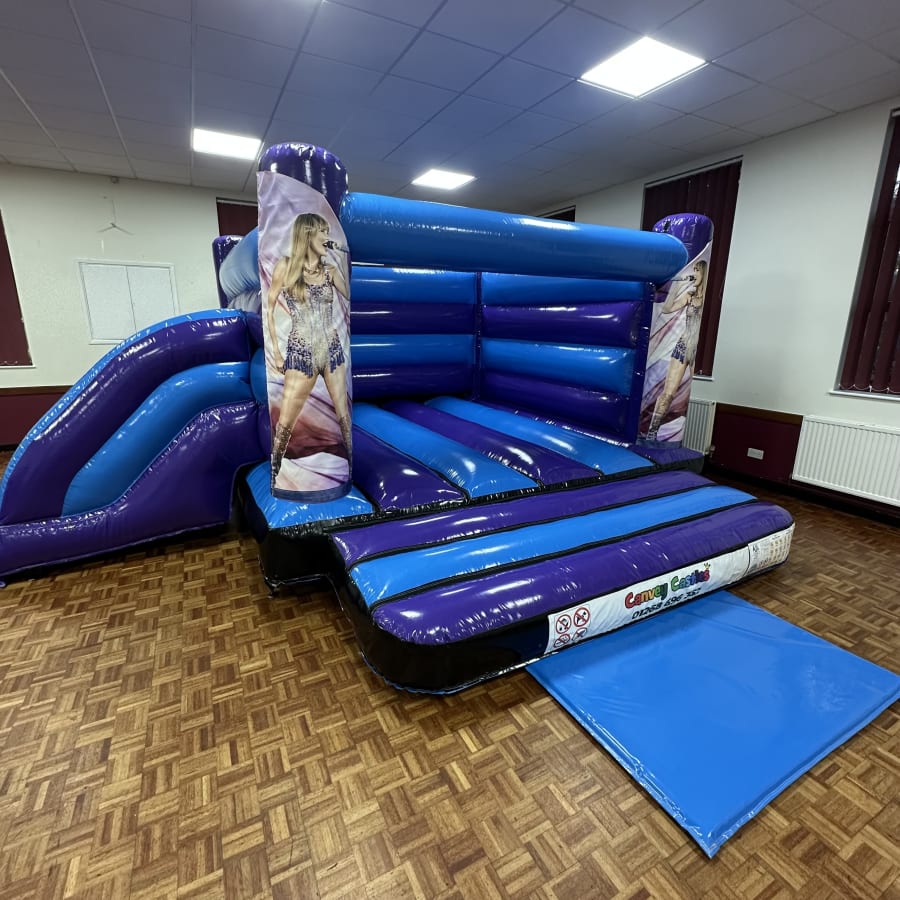 Bring star-power to your party with the 16ft x 17ft Blue and Purple Taylor Swift Low Height Slide Combo Bouncy Castle. Perfect for themed birthdays and family events. Book with canvey castles 16ft x 17ft Blue and Purple Taylor Swift Low Height Slide Combo Bouncy Castle in essex for reliable delivery and setup. This low-height combo blends a roomy bounce area with an easy slide. It’s designed for kids, built for fun, and cleared for safety.