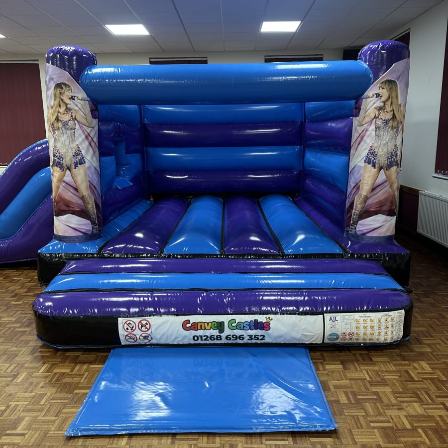 Reserve the 16ft x 17ft Blue and Purple Taylor Swift Low Height Slide Combo Bouncy Castle today. Fast quotes. Local delivery across essex. Secure your date, delight the kids, and trust Canvey Castles for professional setup and safe, memorable fun.