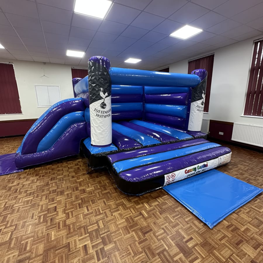 Reserve the 16ft x 17ft Blue and Purple Tottenham Hotspur F.C Low Height Slide Combo Bouncy Castle today. Ideal for birthday parties, corporate family days, and community events across essex. Fast quotes and secure online booking. Ensure your date before it’s gone.