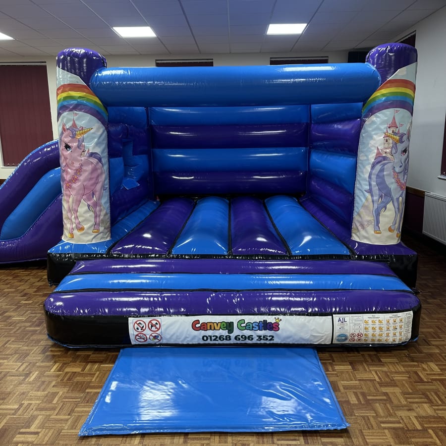Reserve your 16ft x 17ft Blue and Purple Unicorn Low Height Slide Combo Bouncy Castle today. We offer delivery, setup, and collection across essex. Perfect for parties in Canvey Island and surrounding areas. Contact Canvey Castles to check availability and get a fast quote. Make your next event magical.