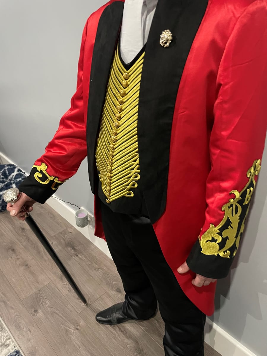 Crafted with attention to detail, this costume features a vibrant red tailcoat, adorned with elaborate gold detailing, and a matching top hat that embodies the essence of a true ringmaster. Whether you're attending a themed party, performing on stage, or simply want to make a grand entrance, this costume will ensure you stand out in any crowd.