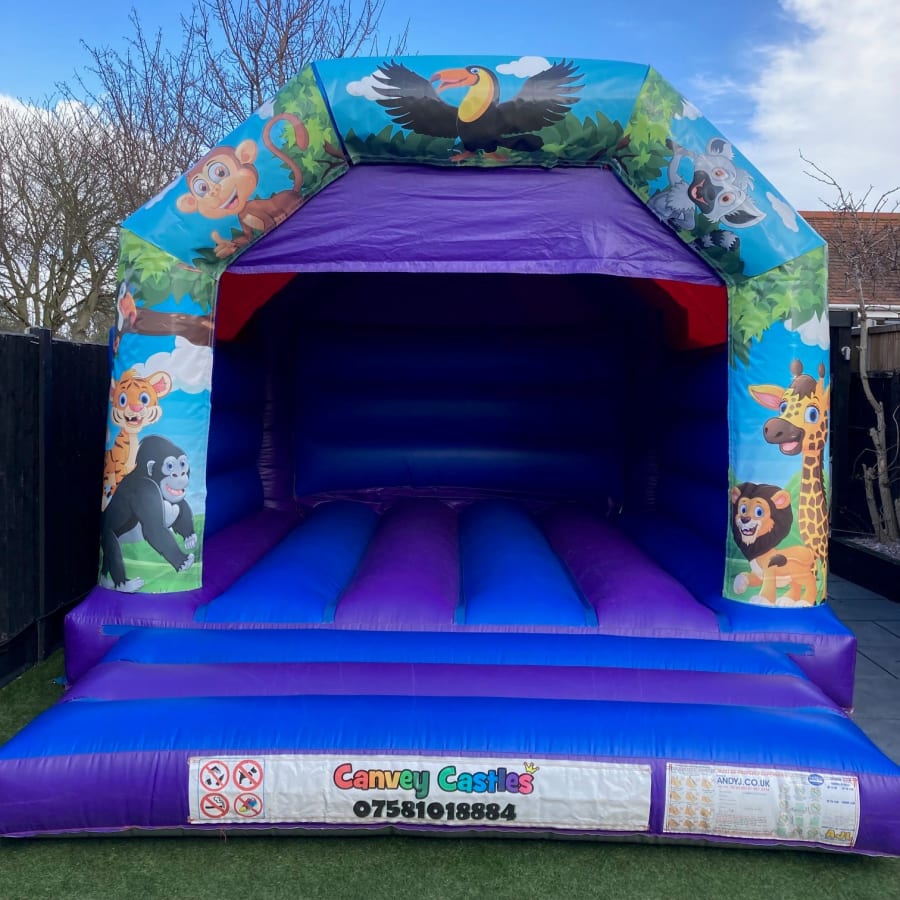 Unleash the ultimate adventure for kids with our 12ft x 15ft Blue and Purple Jungle Bouncy Castle, exclusively available at Canvey Castles. Designed to captivate the imagination, this vibrant bouncy castle will bring a splash of excitement to any event, making it an unforgettable experience for the little ones and their friends.