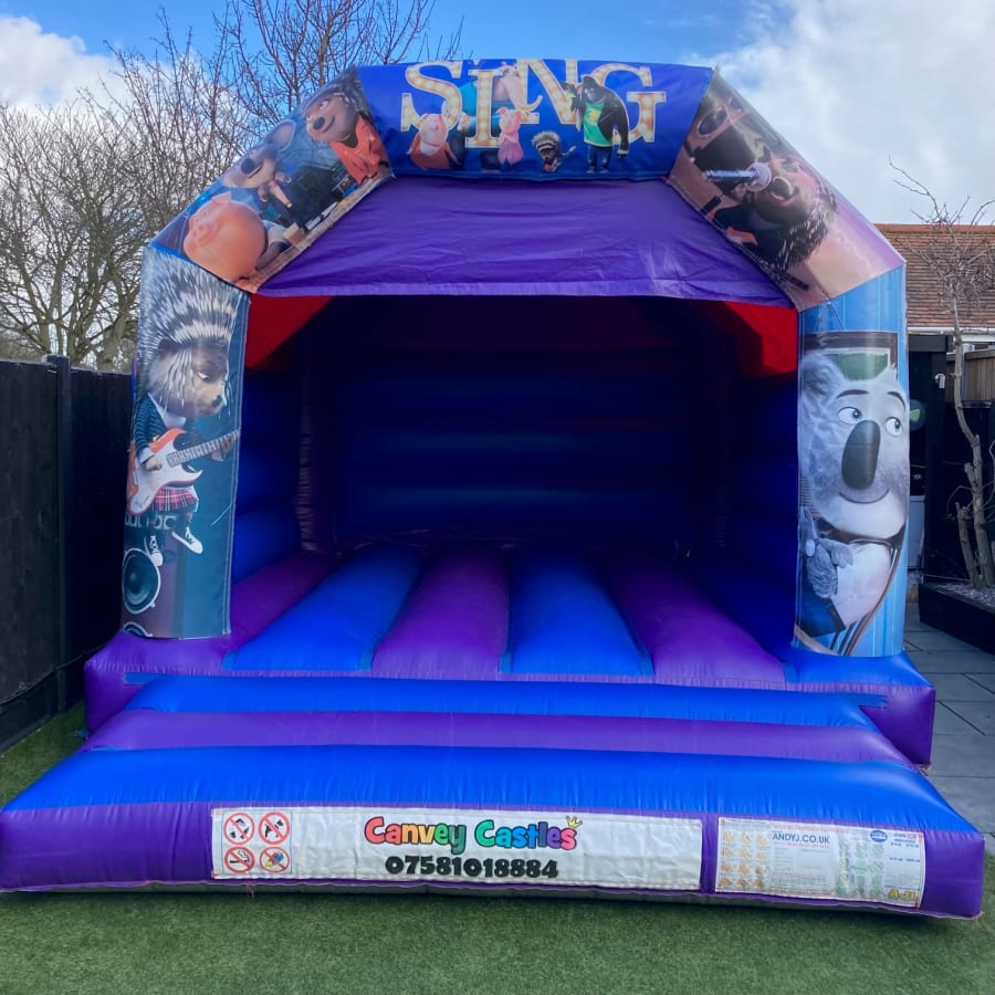 Bring your event to life with the ultimate fun and excitement provided by Canvey Castles. Our canvey castles 12ft x 15ft Blue and Purple Sing Bouncy Castle in Essex is available for hire today. We proudly serve the entire Essex area, delivering not just a bouncy castle but a promise of joy and laughter. Our team ensures timely delivery, setup, and takedown, providing a hassle-free experience for you.