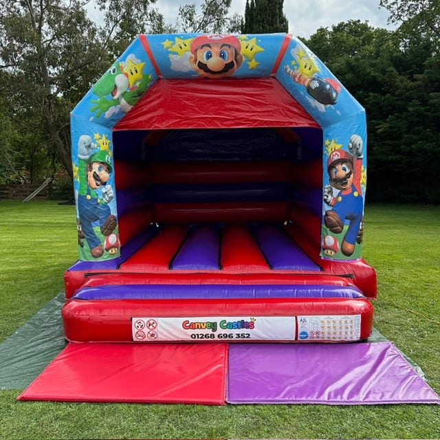 Canvey Castles is proud to offer this exciting bouncy castle for delivery in Essex. Whether you're located in Basildon, Southend, or anywhere in between, we can bring the fun right to your doorstep. Book our 12ft x 15ft Red and Purple Super Mario Bouncy Castle today and make your event unforgettable!