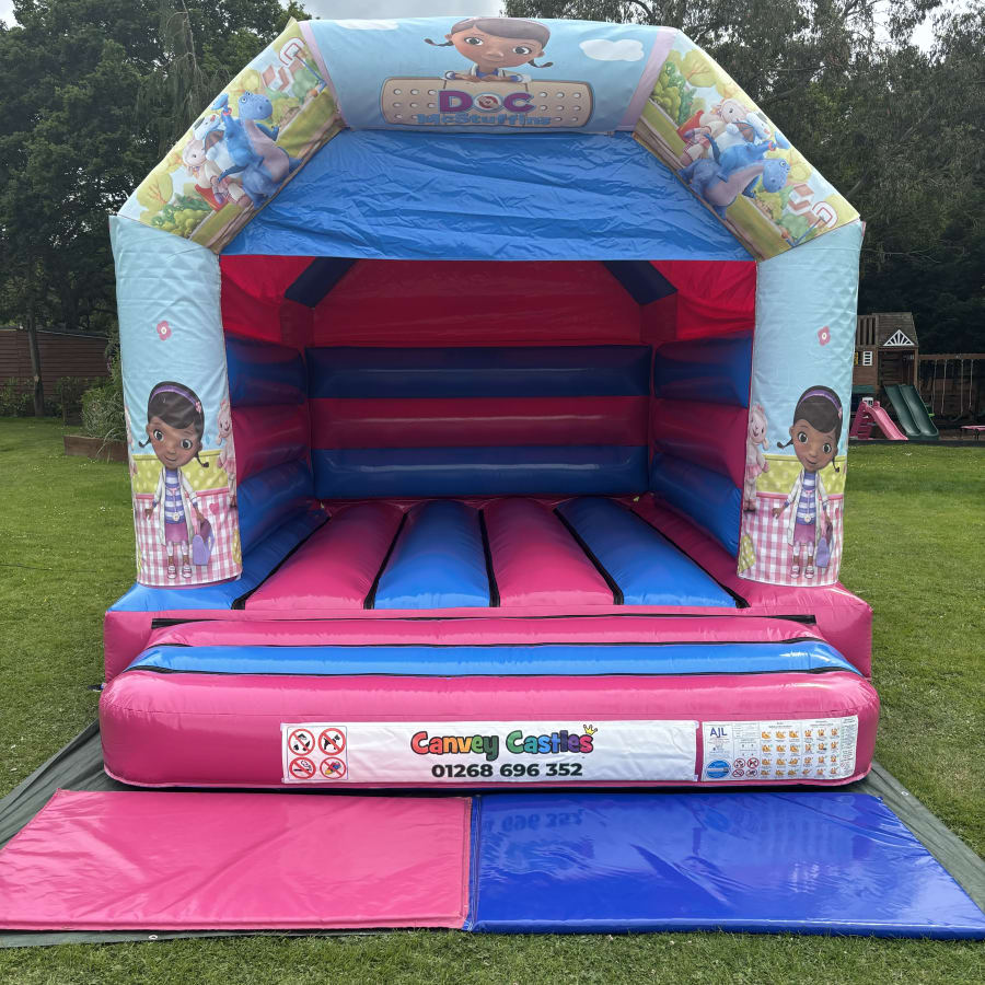 Make your little one's party a memorable one with our 12ft x 15ft Blue and Pink Doc McStuffins Bouncy Castle! Perfect for birthday celebrations and special events, this bouncy castle features a vibrant blue and pink design that will captivate kids of all ages.