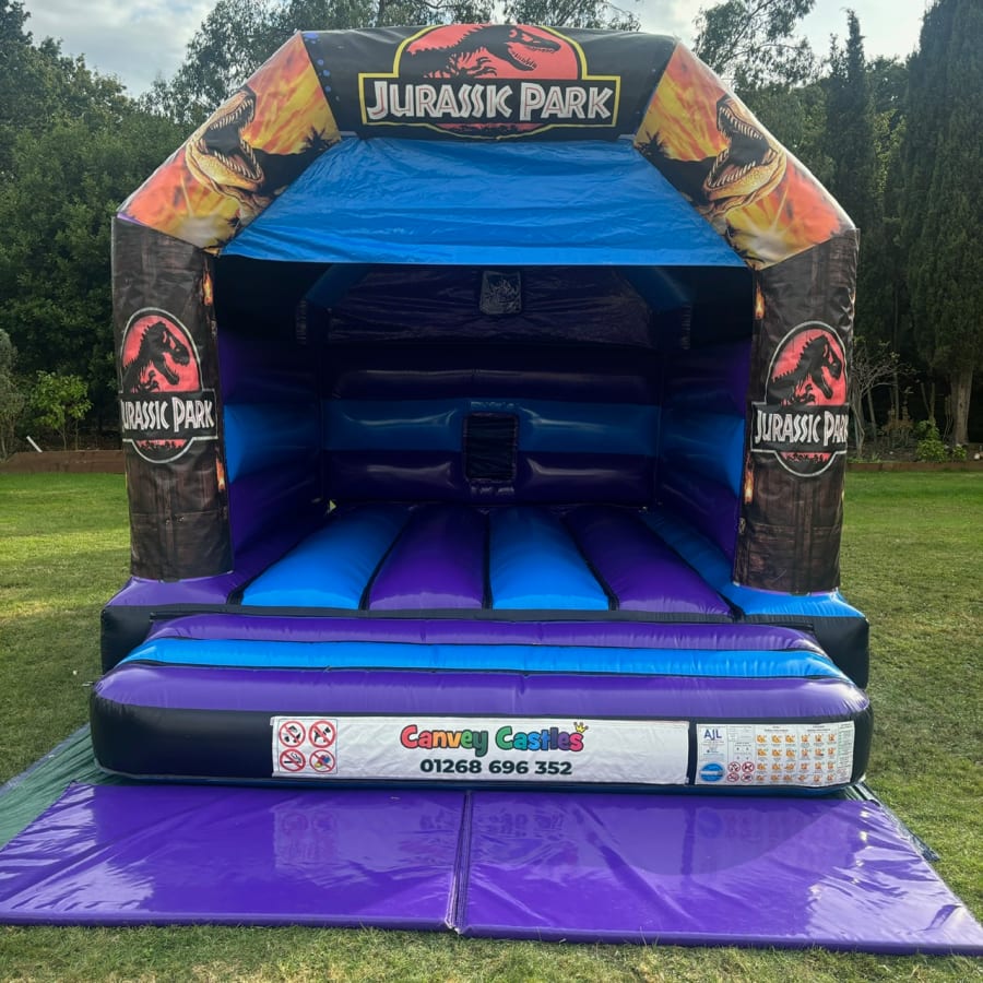 12ft x 15ft Blue and Purple Jurassic Park Bouncy Castle for Unforgettable Fun in Essex