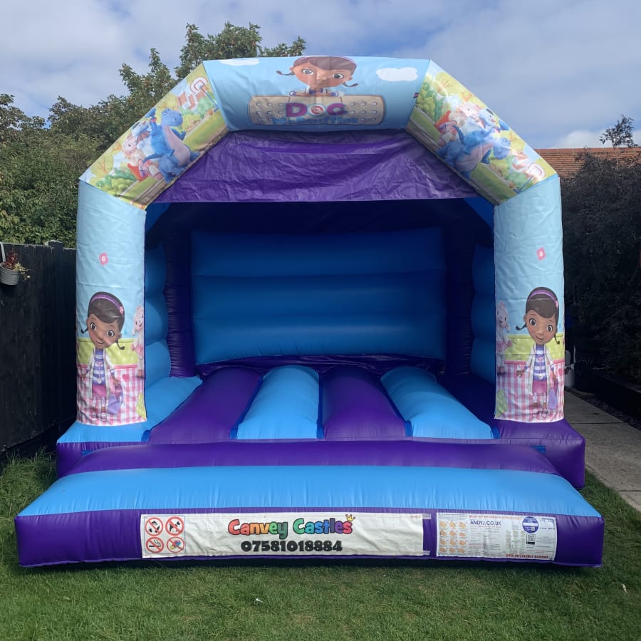 Transform your next children's party into a magical adventure with our enchanting 12ft x 12ft Light Blue and Purple Doc McStuffins Bouncy Castle. This vibrant inflatable is perfect for creating memorable moments at any gathering, from birthday celebrations to school events. Featuring the beloved Doc McStuffins characters in delightful hues of light blue and purple, this bouncy castle is sure to captivate the hearts of little ones.