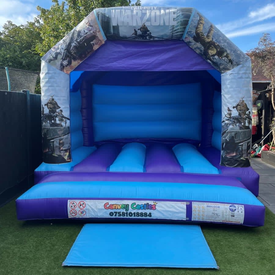 Don’t miss out on the chance to make your event extraordinary. Contact Canvey Castles to book the 12ft x 12ft Light Blue and Purple Call Of Duty Warzone Bouncy Castle in Essex. Our friendly team is ready to help you with all the details and ensure your event is a resounding success. Transform your gathering into an unforgettable experience with the ultimate bouncy castle adventure!