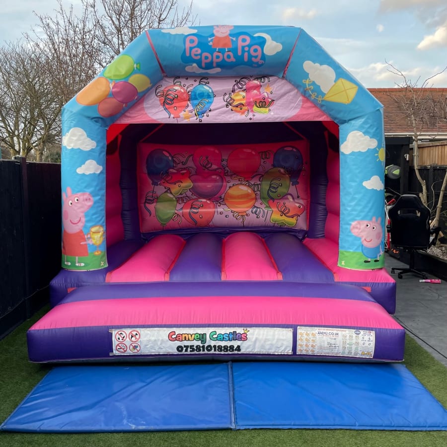 Experience the convenience and reliability of Canvey Castles with our 12ft x 12ft Pink and Purple Peppa Pig Design 1 Bouncy Castle in Essex. We proudly serve the Essex area, bringing happiness and entertainment right to your doorstep. Our professional delivery and setup services ensure you have one less thing to worry about on the day of your event, allowing you to focus on making unforgettable memories.