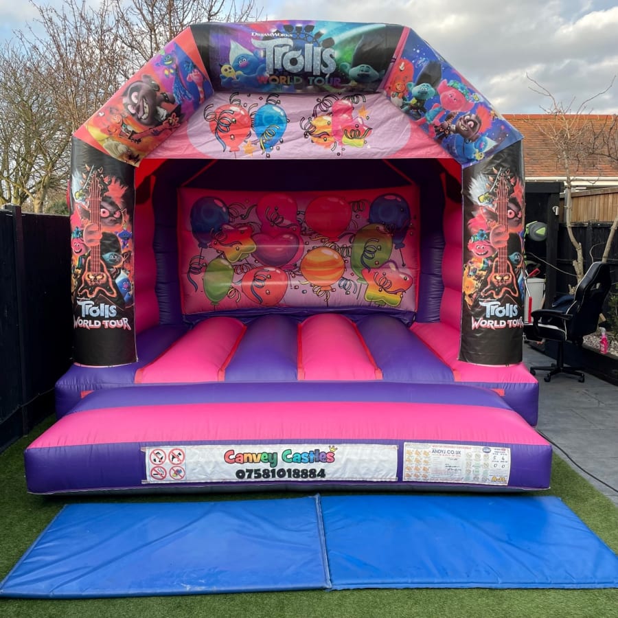 Ready to make your next gathering an exciting adventure? Book the 12ft x 12ft Pink and Purple Trolls World Tour Bouncy Castle in Essex today and let Canvey Castles bring the magic to your doorstep!