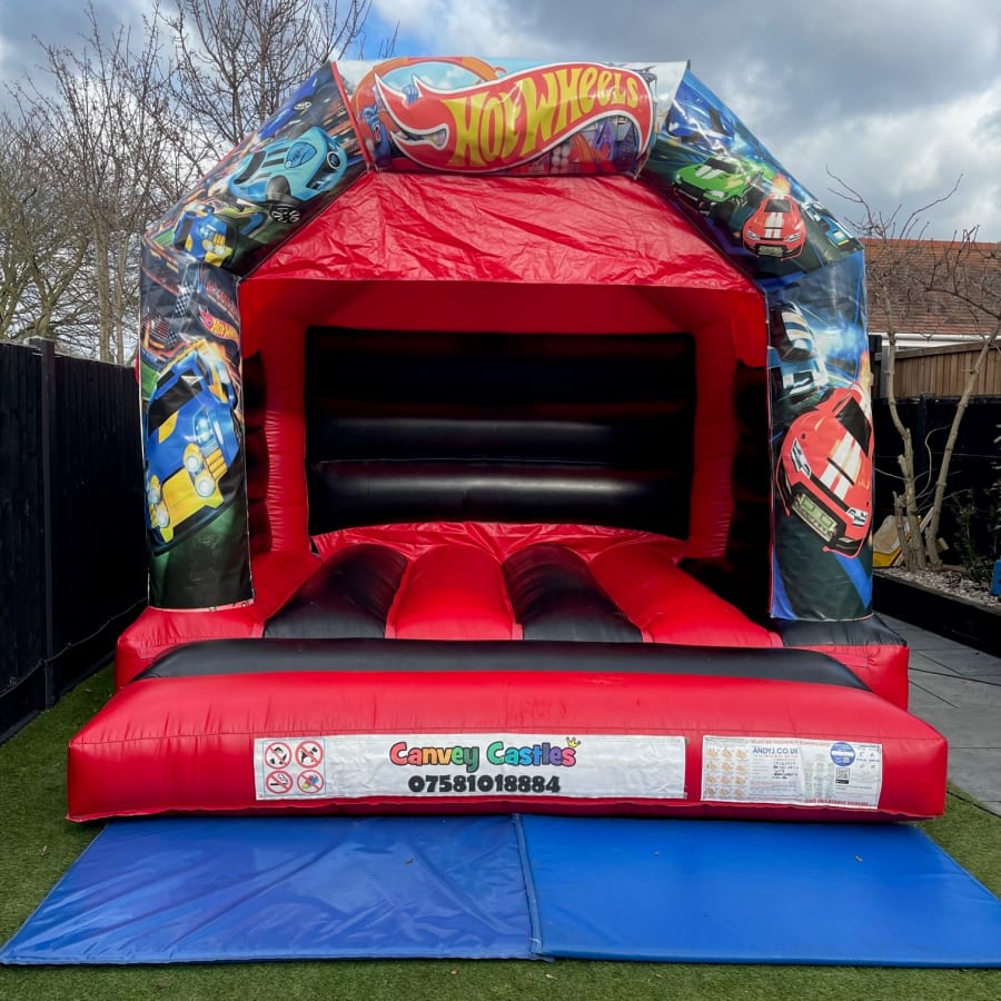 Unleash the Fun with Our 12ft x 12ft Black and Red Hot Wheels Bouncy Castle