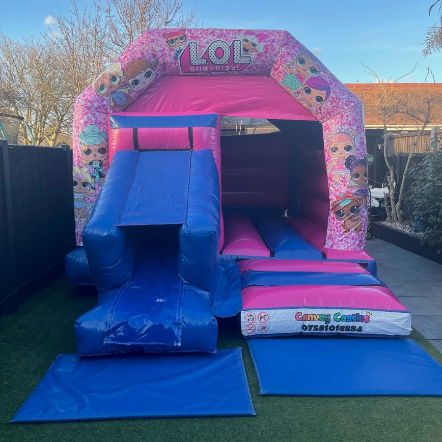 Don't miss out on the opportunity to make your next event unforgettable. Contact Canvey Castles today to book the 12ft x 17ft Pink And Blue LOL Surprise Design 1 Slide Combo Bouncy Castle in Essex, and let the good times bounce!