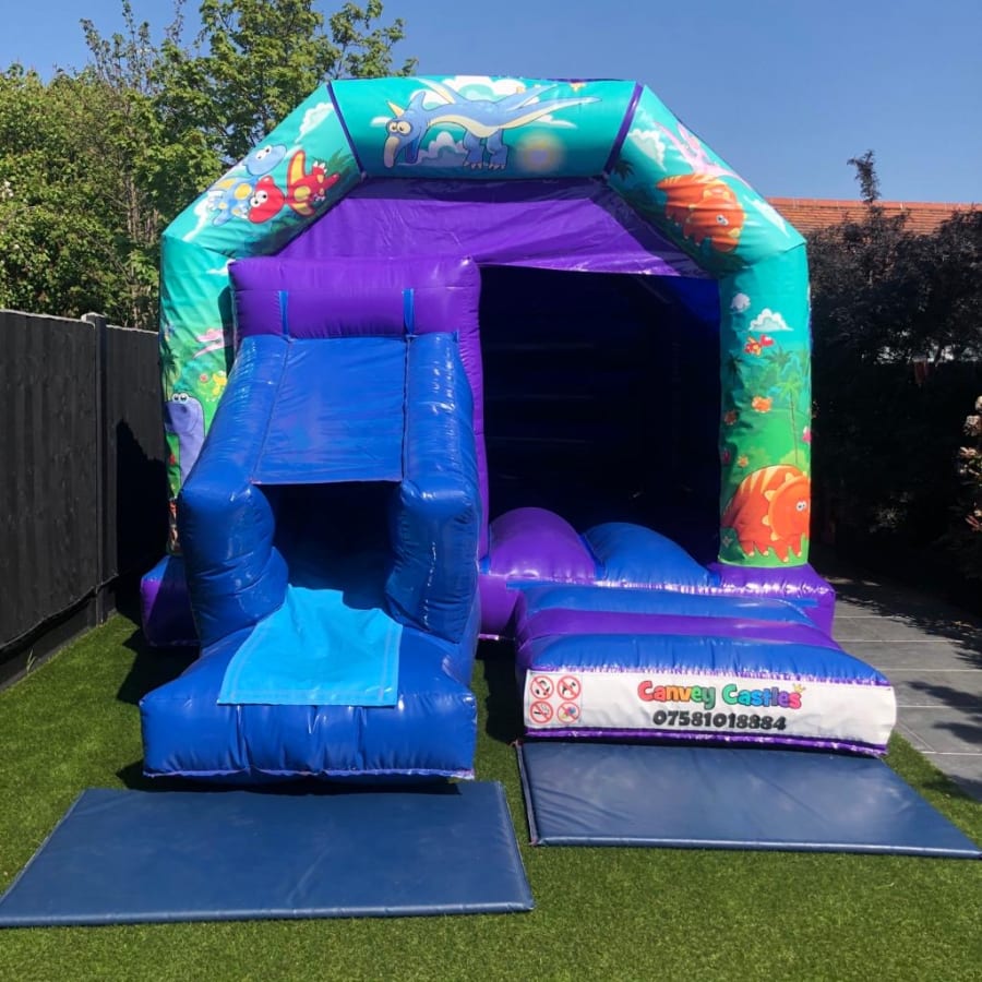 Don't miss the chance to make your next event a roaring success. Book the 12ft x 17ft Blue and Purple Dinosaur Slide Combo Bouncy Castle in Essex today and let the fun begin!
