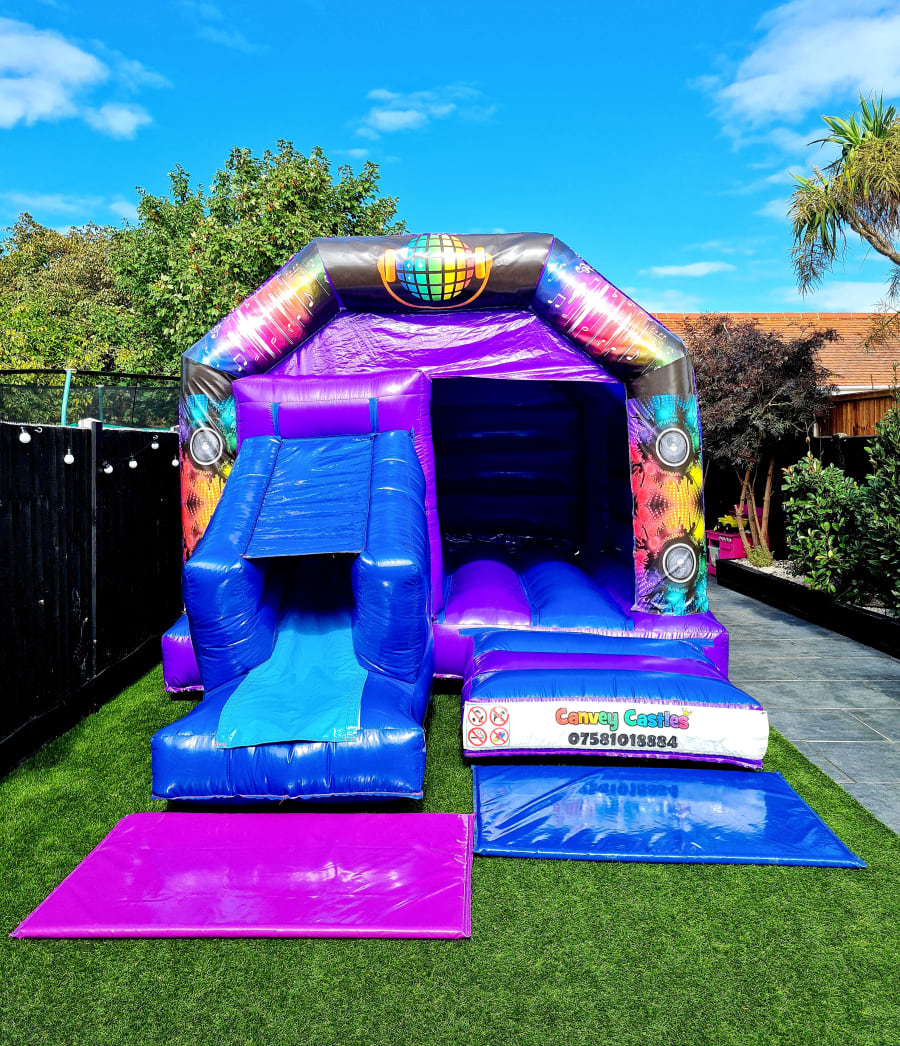 Unleash the Fun with the 12ft x 17ft Blue and Purple Disco Slide Combo Bouncy Castle