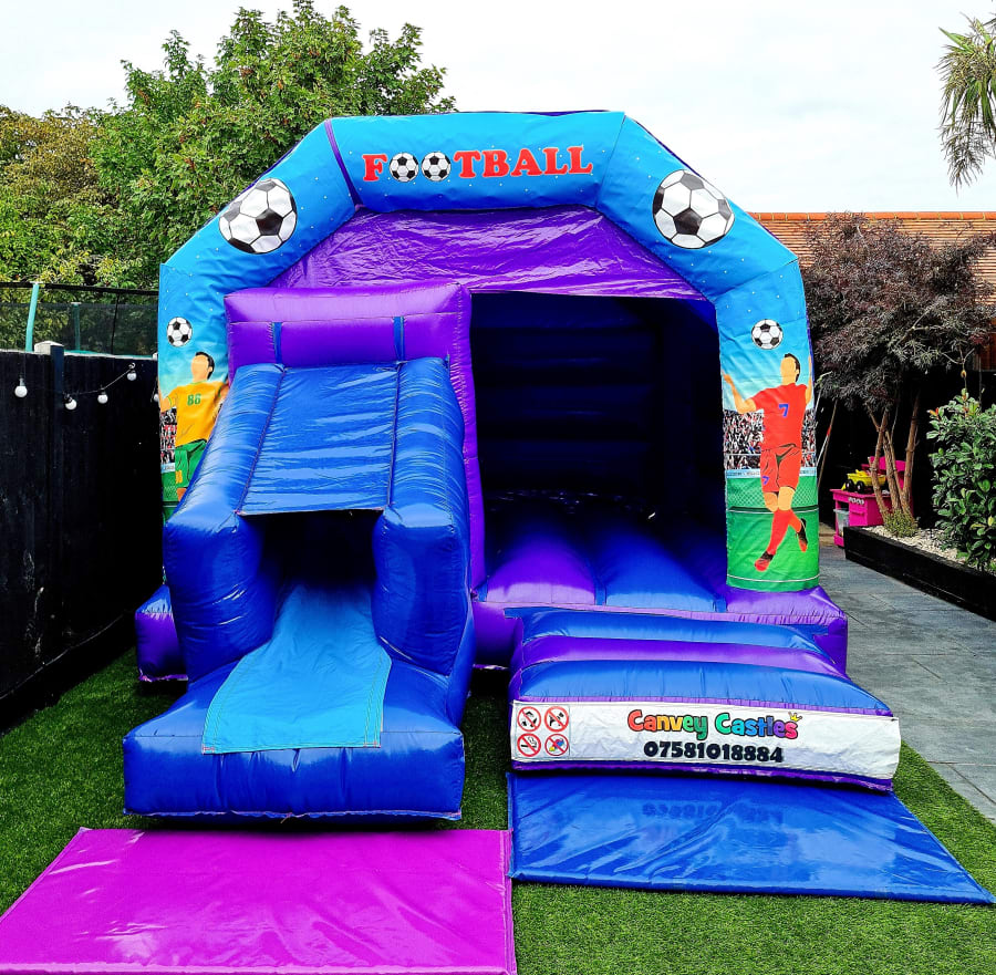 At Canvey Castles, we pride ourselves on delivering high-quality inflatables that guarantee both safety and enjoyment. Our Blue and Purple Football Slide Combo is crafted from durable materials, ensuring it withstands the test of active play while maintaining its vivid colors.
