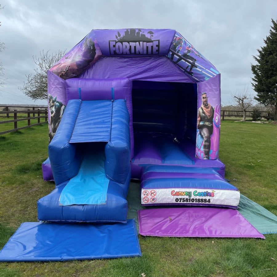 Transform any event into an unforgettable adventure with the 12ft x 17ft Blue and Purple Fortnite Design 2 Slide Combo Bouncy Castle. This vibrant and thrilling inflatable is the perfect addition to birthdays, parties, and community events, capturing the hearts of Fortnite fans and adventurers alike. Its dynamic design and dual slide feature provide endless entertainment, making it a must-have for fun-loving gatherings.